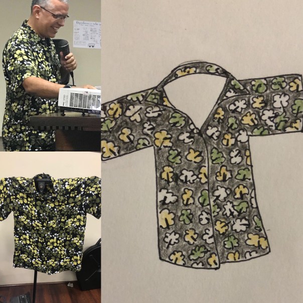 Num dos dias fiz o desenho da camisa florida do pastor Daniel Santos. Ela foi motivo de muitas risadas e ficou famosa! Não podia deixar de registrar.